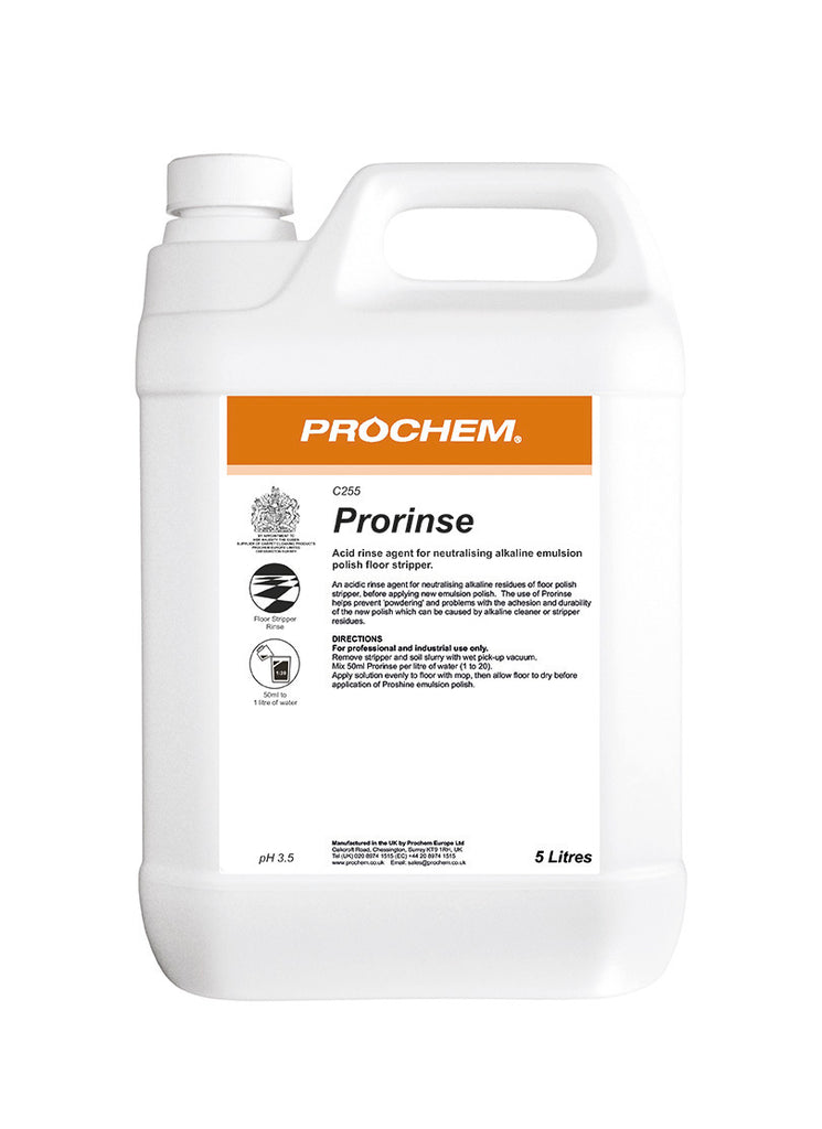 Remove stripper and soil slurry with a wet pick-up vacuum. Apply the diluted Prorinse solution evenly to the floor with a mop, then allow the floor to dry before application of a good floor polish such as Prochem Proshine emulsion polish.