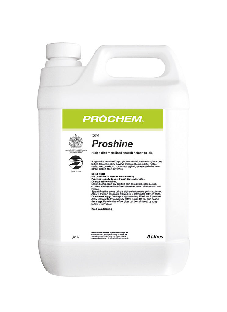 A high solids metallised 'dry-bright' floor finish formulated to give a long lasting deep gloss shine on vinyl, linoleum, thermo-plastic, rubber, sealed wood, cork, concrete, asphalt, terrazzo and other non-porous smooth floors coverings. industrial use only. Proshine is ready-to-use. Do not dilute with water. Do not shake container. Ensure floor is clean, dry and free from all residues. Semi-porous, concrete and impoverished floors should be sealed with a base coat of Proseal. Spread Proshine evenly using a slightly damp mop or polish applicator. Apply 2 or 3 very thin coats, allowing 30 to 60 minutes between coats. Do not over apply. Coverage is approximately 250 m² per 5L per coat. Allow final coat to dry completely before re-use. Do not buff floor at this stage. Periodically the floor gloss can be maintained by spray buffing with Protreat.